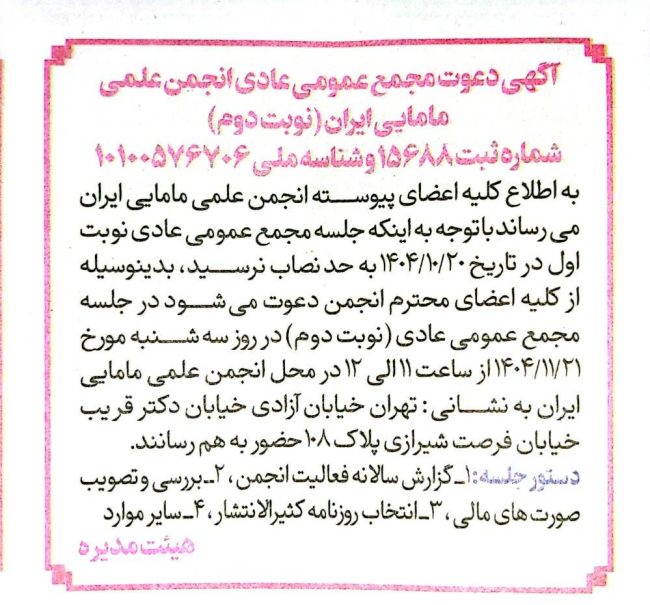 اگهی دعوت به مجمع عمومی عادی نوبت دوم؛ بهمن ۱۴۰۴