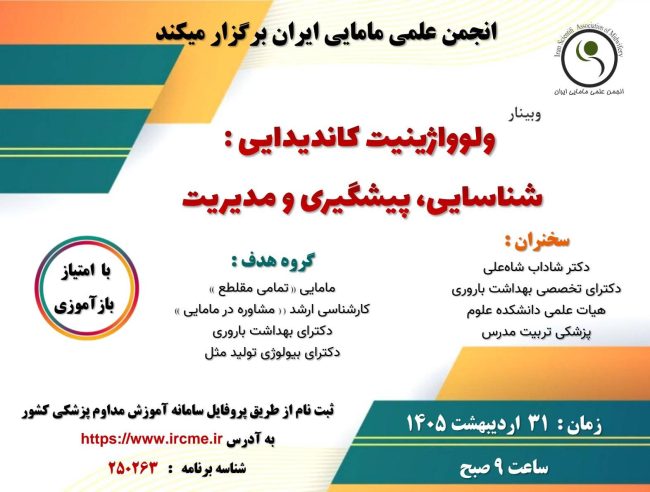 با امتیاز بازآموزی گروه هدف: کلیه مقاطع رشته مامایی ثبت نام از طریق پروفایل سامانه آموزش مداوم پزشکی کشور به آدرس ‎ https://www.ircme.irشناسه : ۲۰۵۷۶۵ ثبت نام